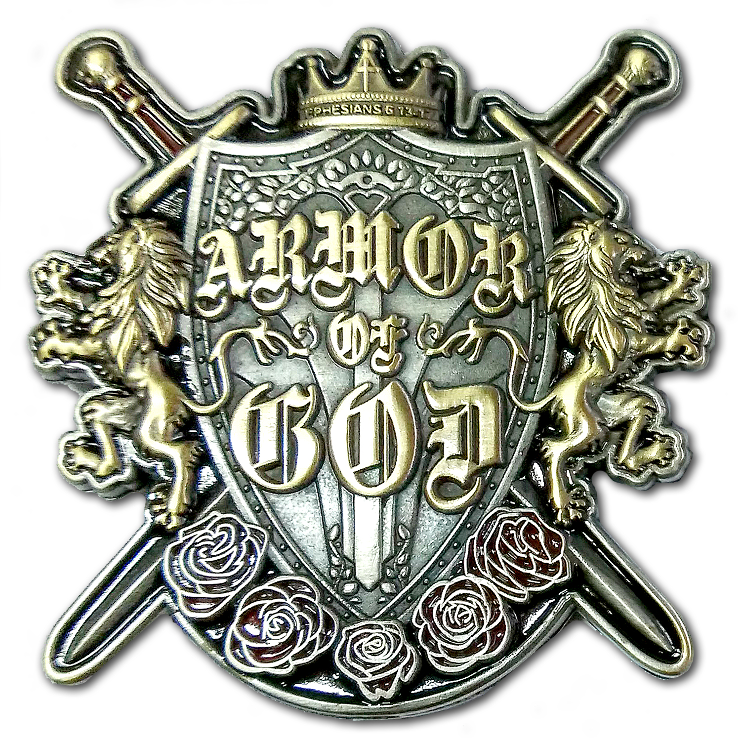 Put On The Whole Armor Of God. What many soldiers over the centuries have held to in terms of their their faith during combat. In battle where their survival was based on a prayer or making a connection with God as they went into harm’s way. The Armor Of God coin which depicts the shield of faith to fight off the wicked darts of our enemies, is inscribed with Armor Of God across its front. Crossed swords representing the swords of spirit which is identified as the word of God also adorn this coin. This Armor Of God coin has been taken into combat by Soldiers, Sailors, Airmen, Marines and Guardsmen when the need for faith was called upon to get through the difficulty of battle.