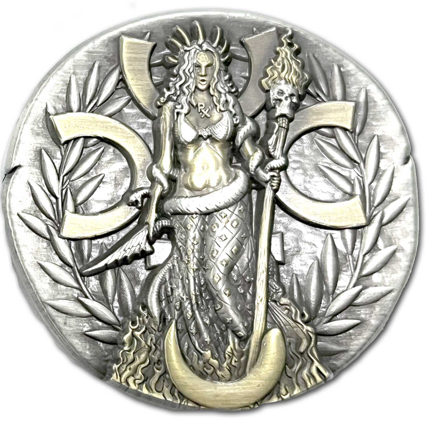 Hecate Greek Goddess of Witchcraft, Crossroads, Night, Light, Magic, Drugs, and the Moon Ancient Collectible Coin was designed to look at the roots of our ancient cultures and what these various Greek gods did and how they influenced society. Both warriors and scholars connected with the Greek gods and these coins in their ancient look are historical examples of this relationship. Each of these ancient Greek god coins is 2 inches and crafted with a dual antique gold and silver metals. Highly detailed each of these relics are unique in both their artistic design and exclusively offered here.