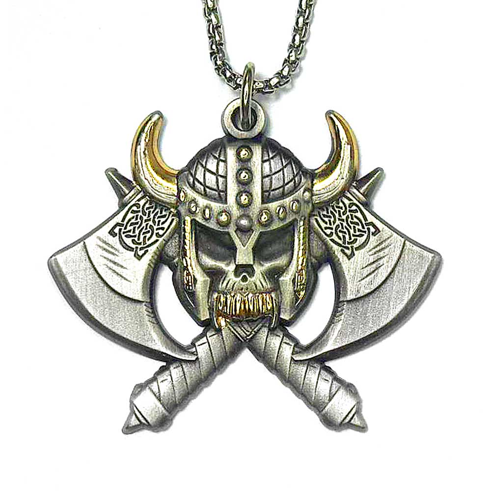 Viking Skull and Double Celtic Hatchets Gold and Sterling Silver Necklace Jewelry with Chain